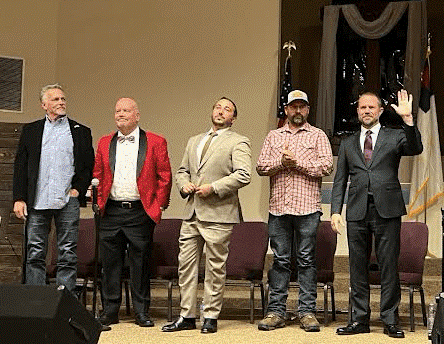 The five GOP candidates running for California Governor that participated in the “Take Our California Back” Forum included from left to right (above): Lewis Herms, Scott Shields, Leo Zacky, David Collenberg, and Coby Marcum. Also pictured is Kim Yeater (far left) and Dr. Douglas G. Frank (far right).
